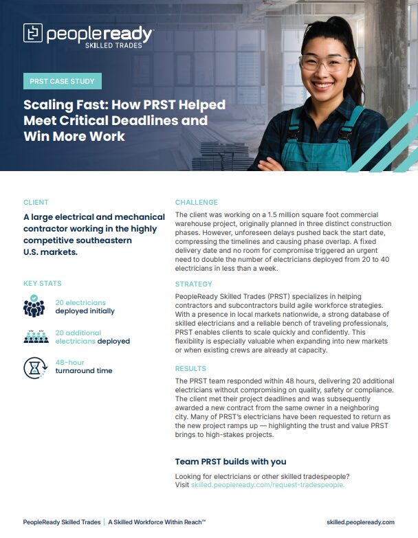 A large electrical and mechanical contractor working in the highly competitive southeastern U.S. market was working on a 1.5 million square foot commercial warehouse project. It was originally planned in three distinct construction phases. However, unforeseen delays pushed back the start date, compressing the timelines and causing phase overlap. A fixed delivery date and no room for compromise triggered an urgent need to double the number of electricians deployed from 20 to 40 electricians in less than a week.